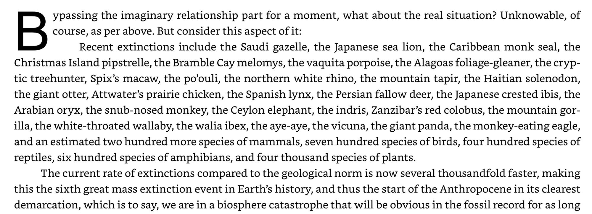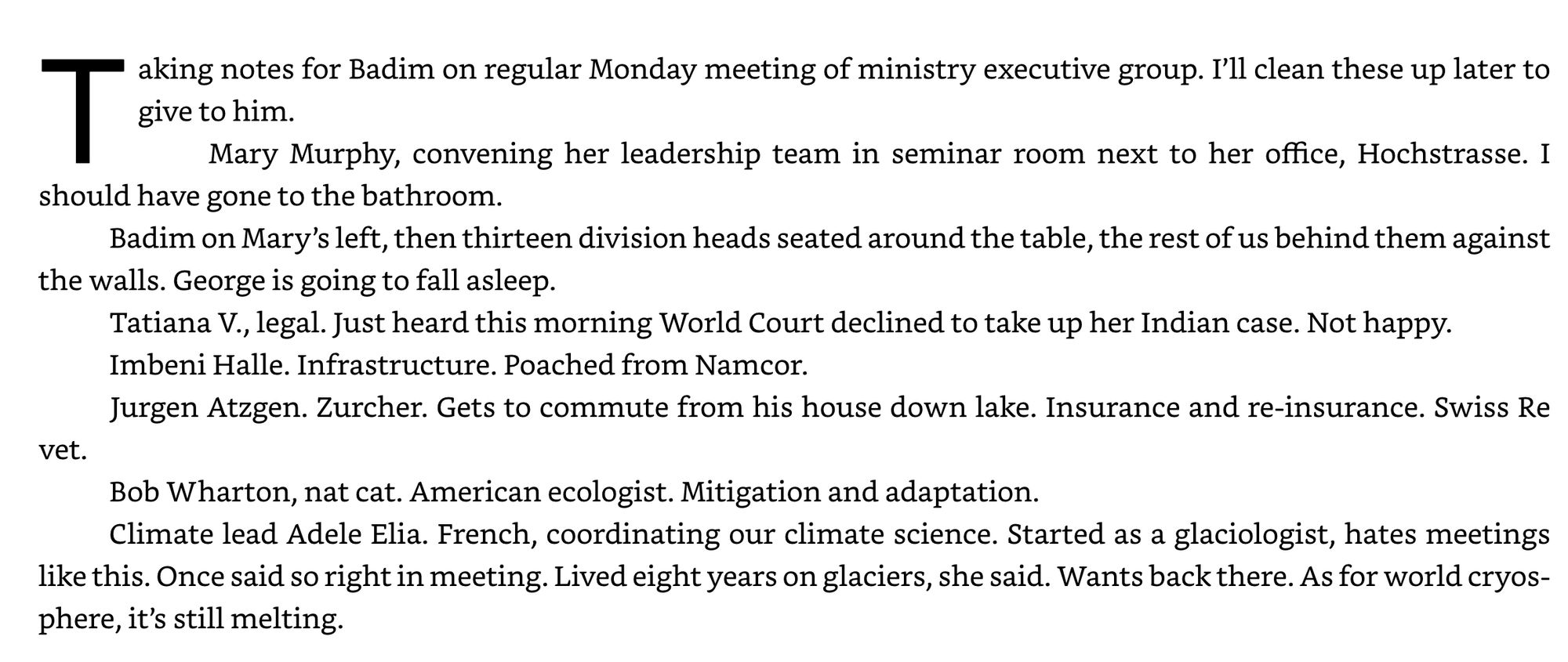 Putting that aside, Ministry for the Future fails because it tries to be two things simultaneously: a speculative technical discussion on how to solve climate change AND a sci-fi novel. It fails at both. As a technical report, it's full of ineptly-executed literary wibble. As a novel, it skips...well, the absolute basics. Plot, character, dialogue - you name it, it doesn't do it.