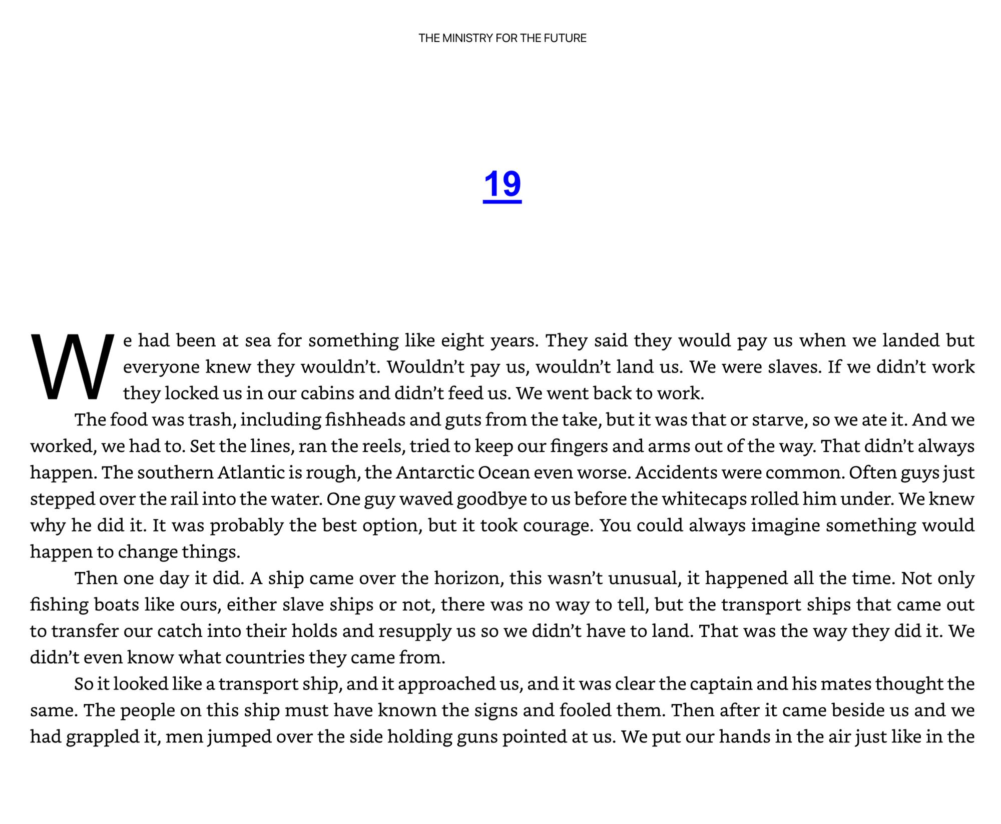 I loved the Red Mars trilogy by the same author (and would recommend it). And, as a result, was shocked by how much I disliked Ministry for the Future. I was so amazed, in fact, this pile of dross was published (and attracted fawning commentary) that I screen-shotted sections as I was reading. Below are some egregious examples, although - to be honest - most of the 10% plus I read was like this.