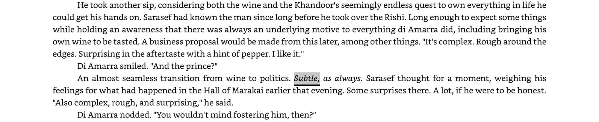 In conclusion, I’d definitely give this book at least 4.6/4.7. However, I feel there two novels stapled together - one which deserves a clear 5.0 (the Zahara-Muradi romance) and the other that probably warrants a 4.9 (the milieu-rich desert military fantasy).